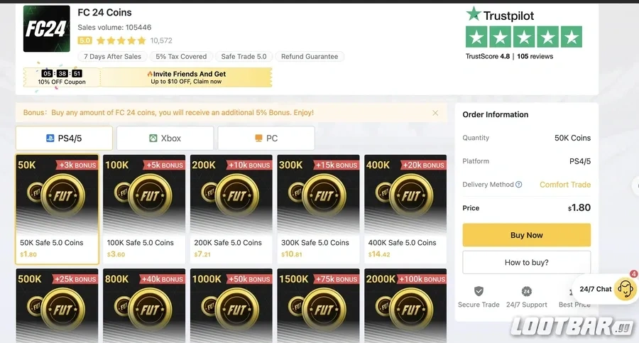 LootBar stands out as a premier destination for all your gaming currency needs, offering a secure and efficient way to buy EA FC 24 coins. The platform boasts a fast delivery system, ensuring that your FC 24 coins buy experience is smooth and immediate, allowing you to dive right back into the action. With competitive prices and a user-friendly interface, LootBar makes the purchasing process a breeze for gamers around the world. Whether you're on Xbox or PC, buying FIFA coins has never been easier. So why wait? Head over to LootBar and give your FC 24 squad the edge it deserves!